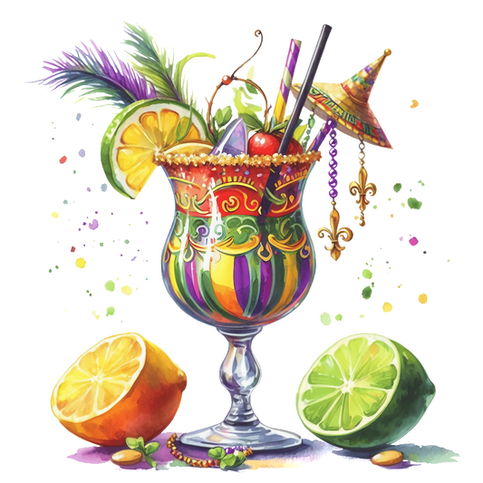 A vibrant, decorative cocktail garnished with fruit, colorful straws, and a festive umbrella, accompanied by sliced citrus fruits.DTF Transfers