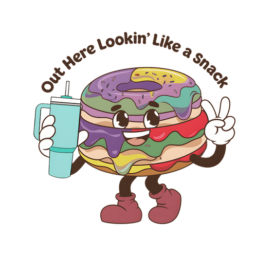 A cheerful, colorful cartoon donut holding a drink and striking a pose, surrounded by the playful phrase "Out Here Lookin' Like a Snack."DTF Transfers