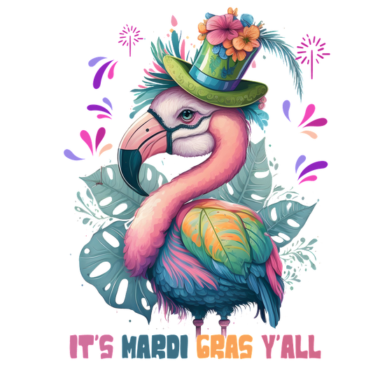 This vibrant Mardi Gras-themed design features a colorful flamingo wearing a festive hat, surrounded by tropical leaves and playful text.DTF Transfers