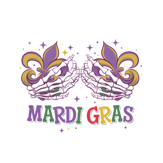 Celebrate Mardi Gras with this vibrant and festive graphic featuring bold, colorful lettering and a fun party hat design!DTF Transfers