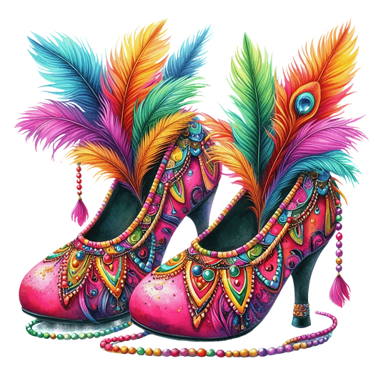 Vibrantly decorated high-heeled shoes featuring colorful feathers, intricate beadwork, and bold patterns, perfect for a festive occasion.DTF Transfers
