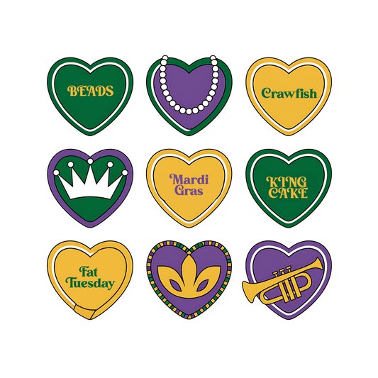 A vibrant collection of heart-shaped stickers featuring Mardi Gras themes, including "Beads," "Crawfish," "Mardi Gras," and "King Cake."DTF Transfers