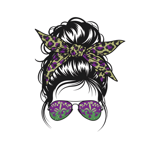A stylish illustration featuring a chic bun hairstyle adorned with a leopard print scarf and vibrant sunglasses with a floral design.DTF Transfers
