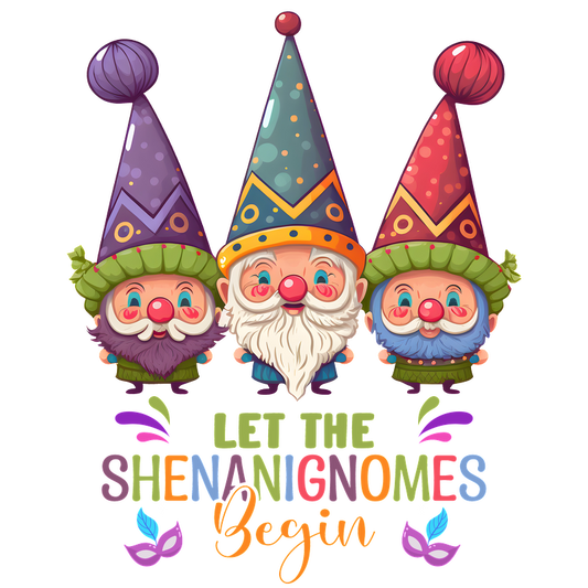 Meet the colorful trio of whimsical gnomes, ready to bring fun and mischief with the phrase "Let the Shenanignomes Begin!"DTF Transfers