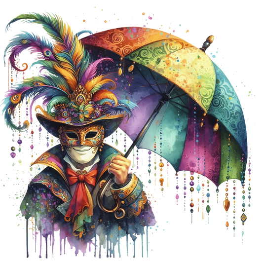 A vibrant, colorful figure adorned in a feathered hat and an ornate coat holds a multicolored umbrella, exuding a festive spirit.DTF Transfers