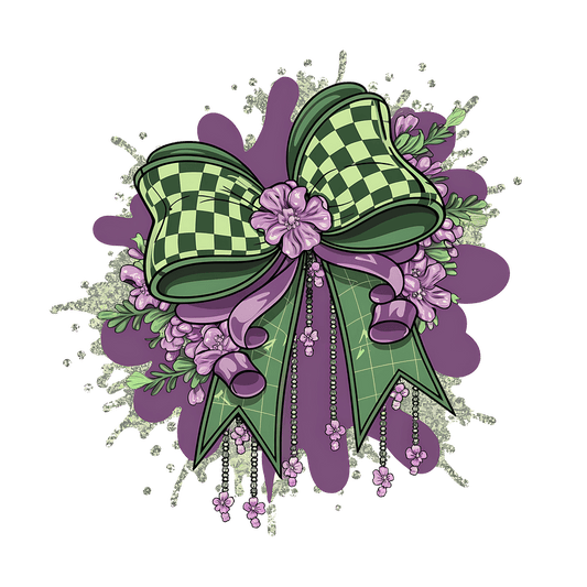 A vibrant illustration featuring a large green and black checkered bow adorned with delicate purple flowers and decorative ribbons.DTF Transfers