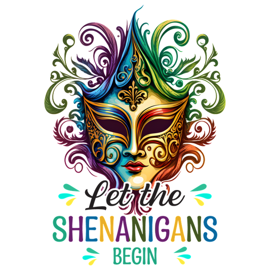 A vibrant, colorful mask design featuring intricate patterns, surrounded by playful swirls, with the phrase "Let the Shenanigans Begin!"DTF Transfers