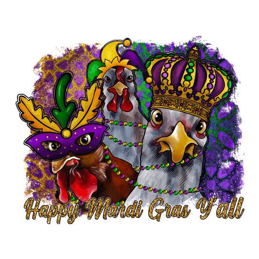 Celebrate Mardi Gras with this vibrant illustration featuring festive chickens adorned with masks, crowns, and colorful beads!DTF Transfers