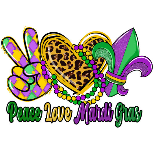Celebrate Mardi Gras with vibrant colors and playful symbols, featuring a peace sign, heart, and festive beads!DTF Transfers