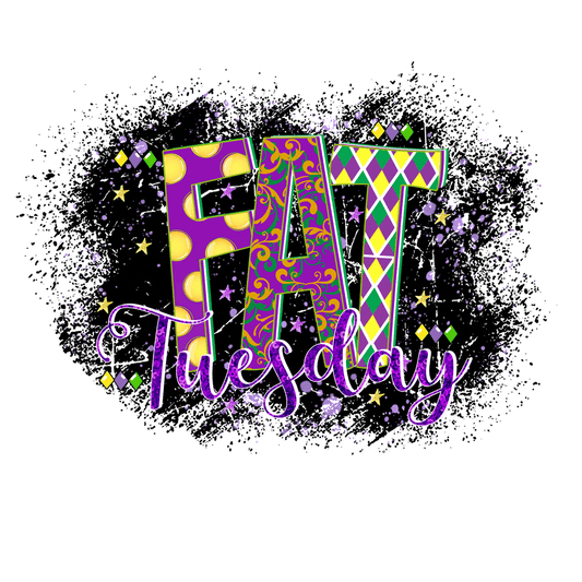 Celebrate Fat Tuesday with this vibrant and festive design, featuring colorful lettering and sparkly accents for a joyful touch!DTF Transfers