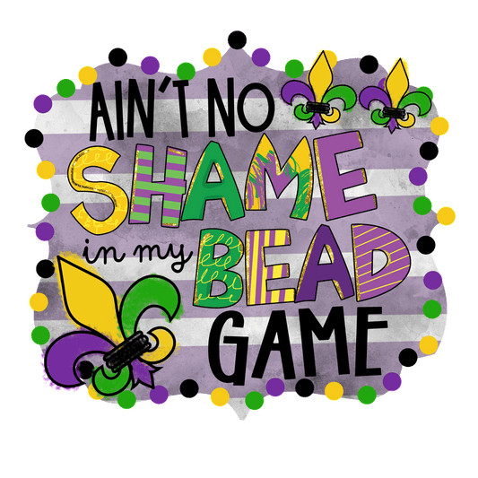 Celebrate Mardi Gras with this vibrant graphic reading "Ain't No Shame in My Bead Game," featuring colorful lettering and playful accents!DTF Transfers