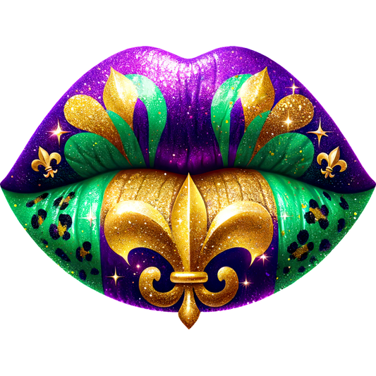 Vibrant, sparkling lips adorned with purple, green, and gold colors, featuring a regal fleur-de-lis design, perfect for carnival celebrations.DTF Transfers