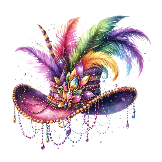 Vibrant and extravagant, this decorative hat features colorful feathers, jeweled accents, and a stunning floral centerpiece, perfect for celebrations.DTF Transfers