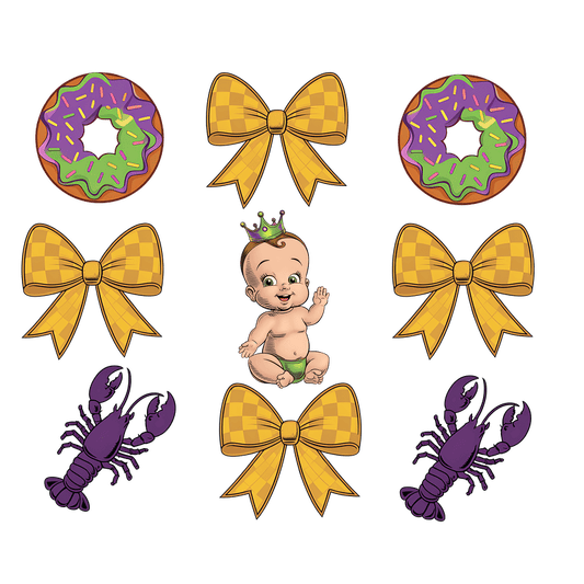 A whimsical collage featuring cartoon-style elements: a crowned baby, colorful donuts, vibrant bows, and playful lobsters, all on a black background.DTF Transfers