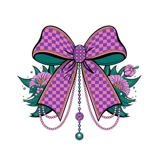 A vibrant, purple checkered bow adorned with floral accents and decorative beads, perfect for adding a touch of whimsy!DTF Transfers