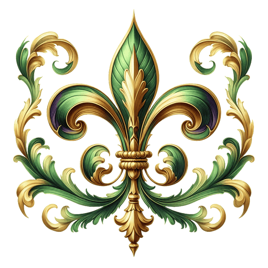 This decorative design features a lush green and gold fleur-de-lis surrounded by intricate swirls, showcasing elegant artistry.DTF Transfers