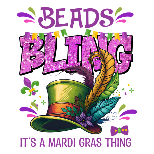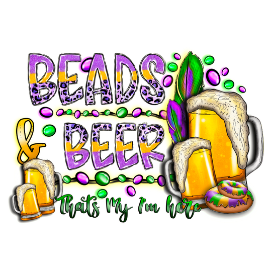 Celebrate with this vibrant "Beads & Beer" design, featuring frosty mugs, colorful beads, and festive elements for a lively vibe!DTF Transfers