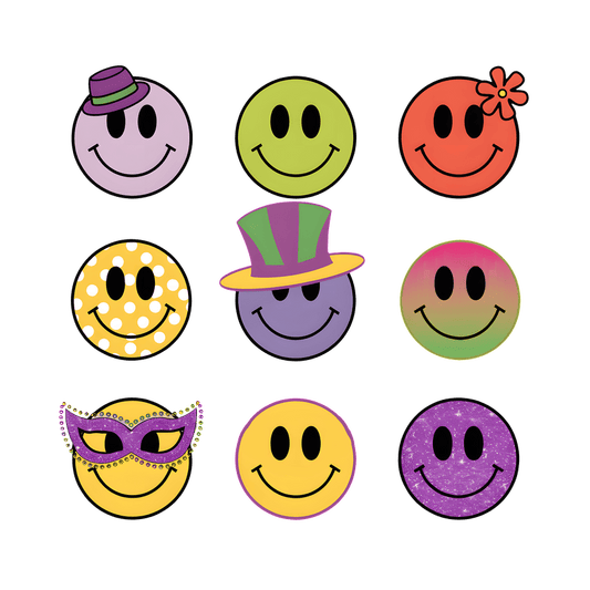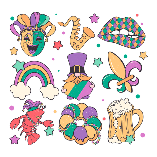 Celebrate Mardi Gras with this playful collection featuring a jester, saxophone, rainbow, bearded figure, musical notes, and festive treats!DTF Transfers