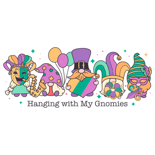 Regular price From £0.75 GBPRegular priceUnit price / per£2.40 GBPSale price From £0.75 GBPA colorful and whimsical illustration featuring charming gnome characters celebrating with festive masks and balloons, embodying a fun party spirit!DTF Transfers