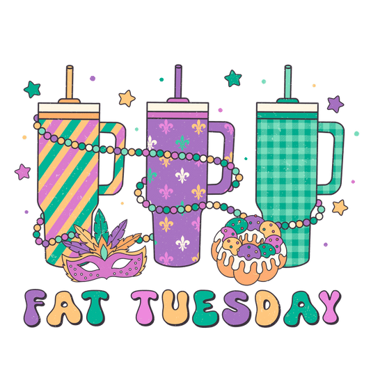 Celebrate Fat Tuesday with colorful drinks, festive beads, a vibrant mask, and a delicious donut, all in a fun design!DTF Transfers