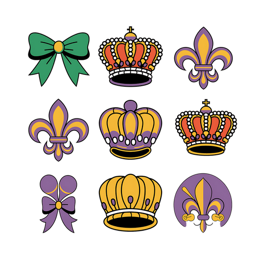 A colorful collection of nine crown and fleur-de-lis designs, featuring vibrant colors and playful details, perfect for festive themes.DTF Transfers