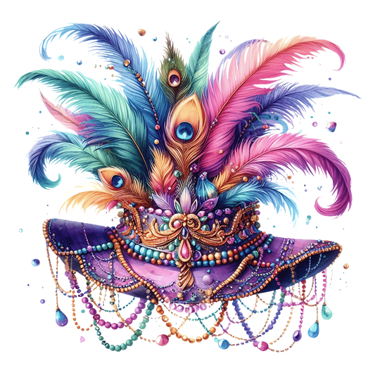 Celebrate Mardi Gras with this vibrant design featuring a colorful top hat adorned with feathers and playful beads!DTF Transfers