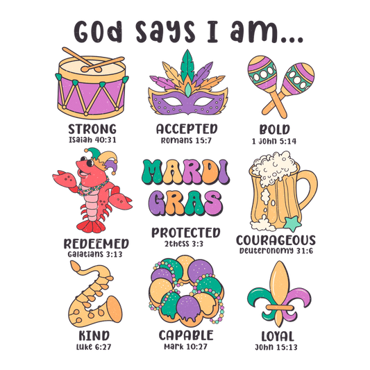 A colorful graphic proclaiming affirmations of identity inspired by Mardi Gras, featuring symbols like a drum, mask, and beads.DTF Transfers