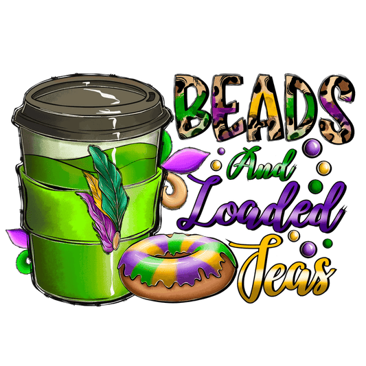 Celebrate the festive spirit with a colorful coffee cup, vibrant donut, and playful text saying “Beads and Loaded Teas.”DTF Transfers