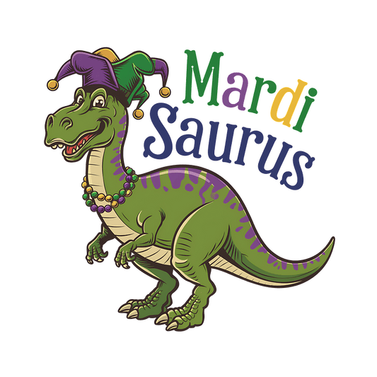 Celebrate Mardi Gras with this playful "Mardi Saurus," a green dinosaur adorned with festive beads and a jester hat!DTF Transfers