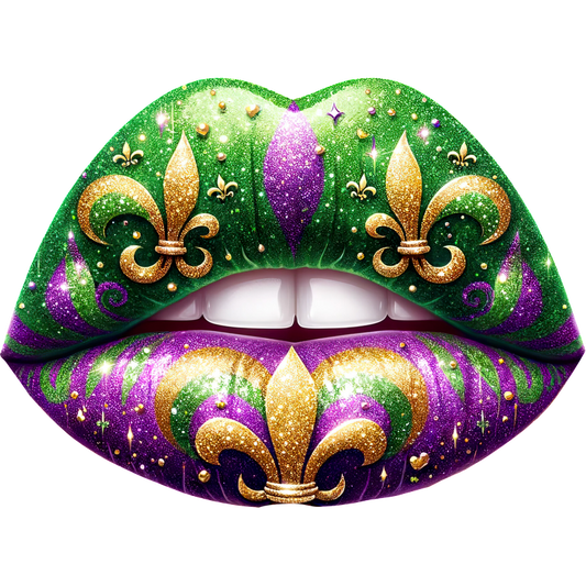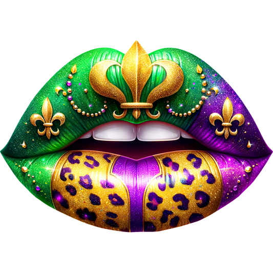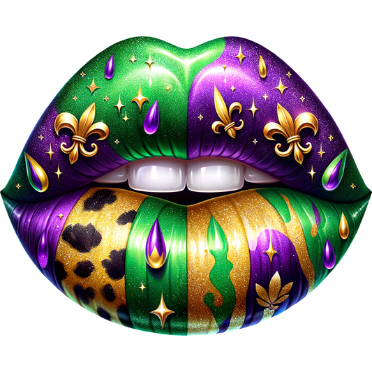 Vibrantly decorated lips showcase a dazzling Mardi Gras theme with purple, green, and gold colors, adorned by playful designs and glitter.DTF Transfers