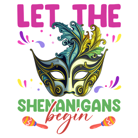 Colorful mask graphic with vibrant feathers, surrounded by playful elements, and the phrase "Let the Shenanigans Begin!" in bold letters.DTF Transfers