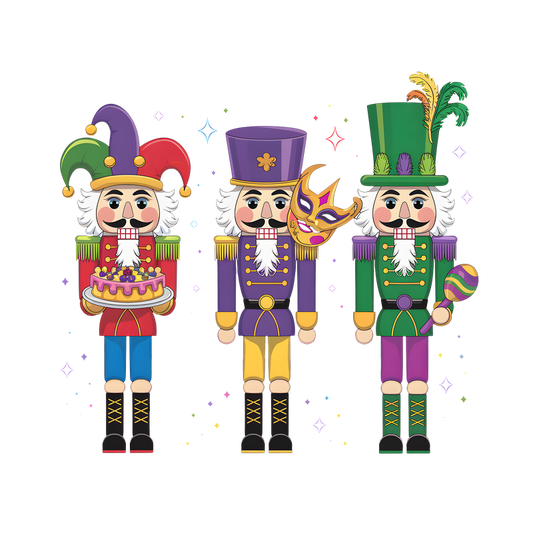 A colorful trio of festive nutcrackers, each adorned with unique outfits and accessories, perfect for celebrating holidays or themed events.DTF Transfers