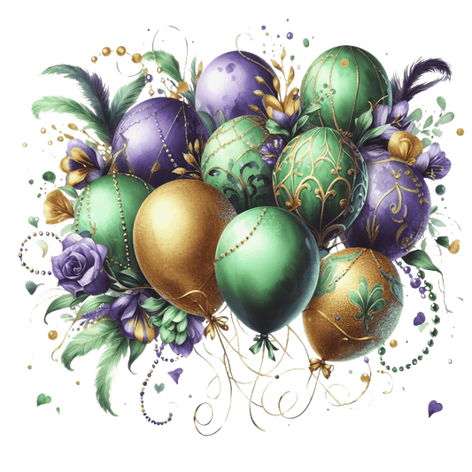 A vibrant arrangement of decorative balloons in shades of green, purple, and gold, accented with floral elements and elegant designs.DTF Transfers