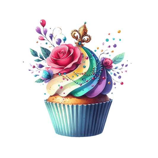 Regular price From £0.75 GBPRegular priceUnit price / per£2.40 GBPSale price From £0.75 GBPA beautifully decorated cupcake featuring vibrant rainbow frosting, adorned with a pink rose and colorful floral accents.DTF Transfers