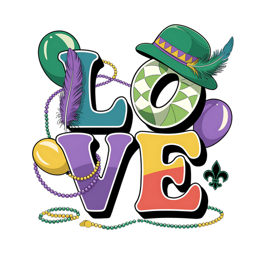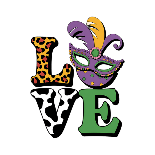 Colorful and playful design featuring the word "LOVE," incorporating animal prints and a festive mask. Great for celebrations!DTF Transfers