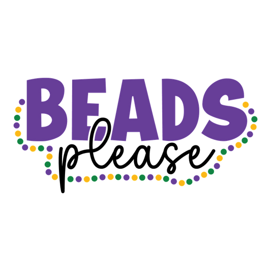 Colorful and playful "BEADS PLEASE" design featuring vibrant purple text with decorative beads in yellow, green, and purple. Perfect for festive occasions!DTF Transfers