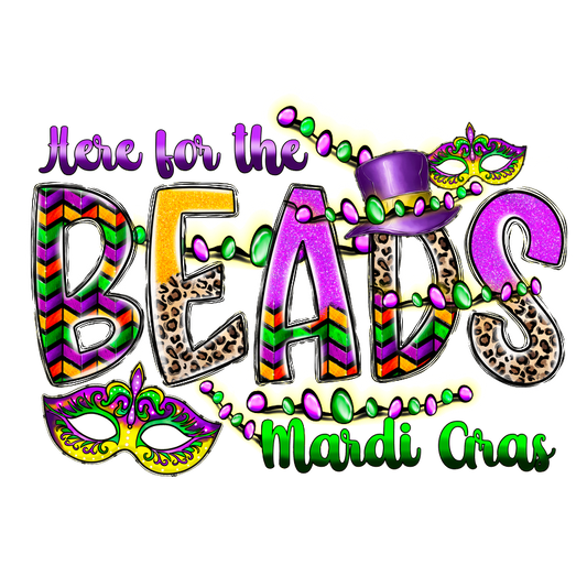 Celebrate Mardi Gras with this vibrant "Here for the Beads" graphic, featuring colorful beads and festive masks!DTF Transfers