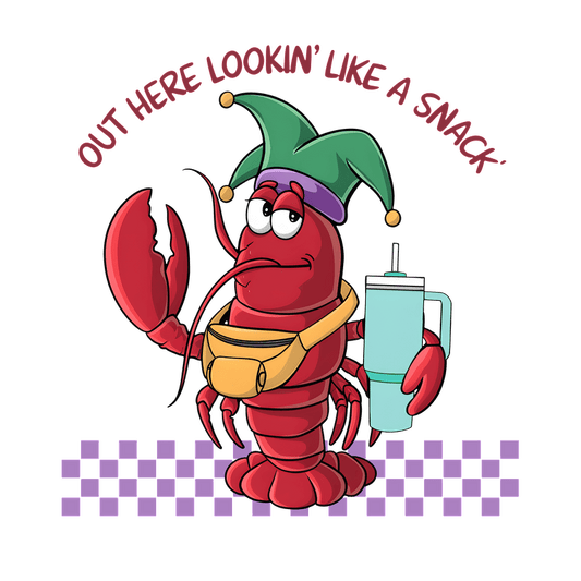 A playful cartoon lobster wearing a festive hat and fanny pack, holding a drink, with the phrase "Out here lookin' like a snack."DTF Transfers