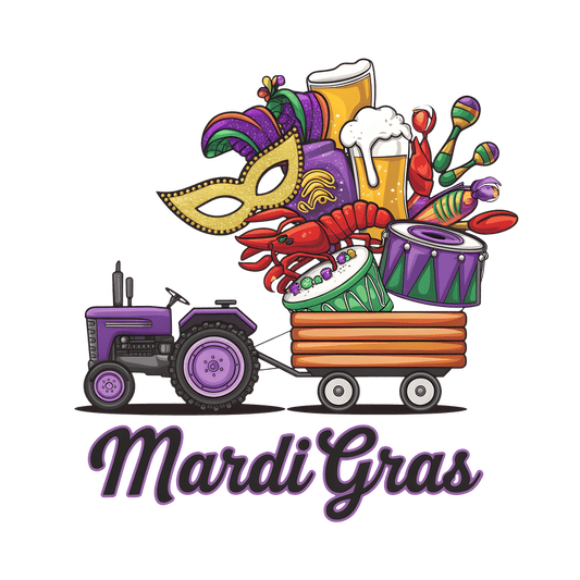 A vibrant Mardi Gras-themed illustration featuring a purple tractor pulling a colorful wagon filled with festive items and decorations.DTF Transfers