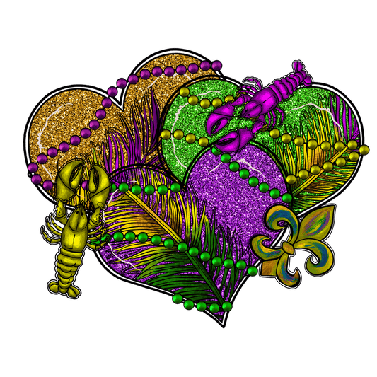 Celebrate Mardi Gras with this vibrant design featuring colorful beads, lobsters, and festive leaves in purple, green, and gold!DTF Transfers