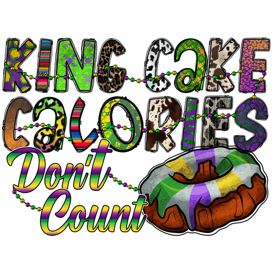 Celebrate Mardi Gras with this colorful and playful design featuring a King Cake and the fun slogan, "Calories Don't Count."DTF Transfers