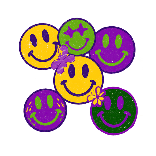 A colorful arrangement of smiley faces in yellow, green, and purple, featuring playful designs and charming decorative elements.DTF Transfers