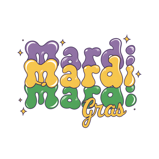 Colorful and playful Mardi Gras-themed typography featuring vibrant purple, green, and yellow letters, perfect for celebrating the festive occasion.DTF Transfers
