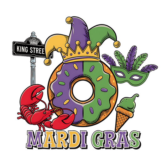 Celebrate Mardi Gras with a vibrant illustration featuring a colorful donut, festive masks, seafood, and ice cream, all inspired by the festival!DTF Transfers