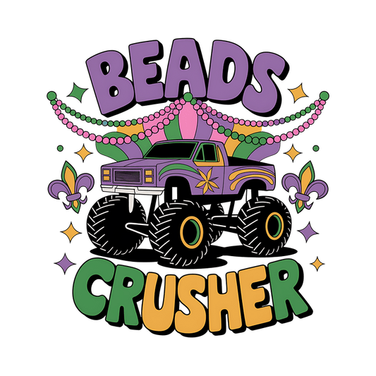 A vibrant graphic design featuring a monster truck adorned with festive beads and the playful text "BEADS CRUSHER."DTF Transfers