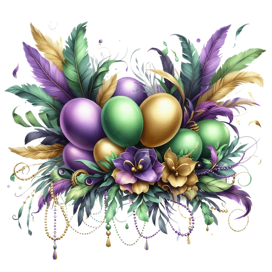Celebrate Mardi Gras with vibrant artwork featuring a jester mask, colorful beads, a festive wreath, and a fleur-de-lis!DTF Transfers