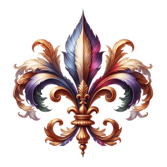 A beautifully detailed, colorful floral motif featuring elegant swirls and a classic fleur-de-lis design, perfect for decorative art.DTF Transfers