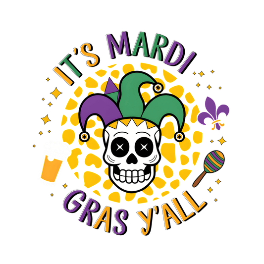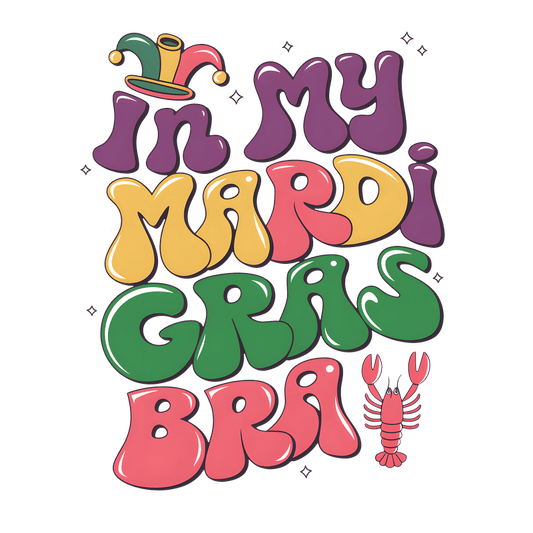 Celebrate Mardi Gras with this vibrant, playful typography design featuring bold colors and a festive jester hat!DTF Transfers