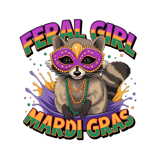 Regular price From £0.75 GBPRegular priceUnit price / per£2.40 GBPSale price From £0.75 GBPFestive raccoon wearing a colorful mask and beads, celebrating Mardi Gras with the playful caption "Feral Girl Mardi Gras."DTF Transfers
