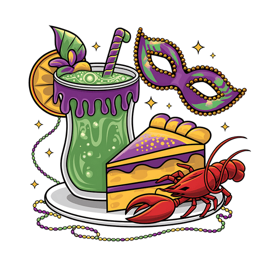 Regular price From £0.75 GBPRegular priceUnit price / per£2.40 GBPSale price From £0.75 GBPCelebrate Mardi Gras with this vibrant design featuring a colorful cake, festive hat, and a playful lobster, perfect for catching throws!DTF Transfers